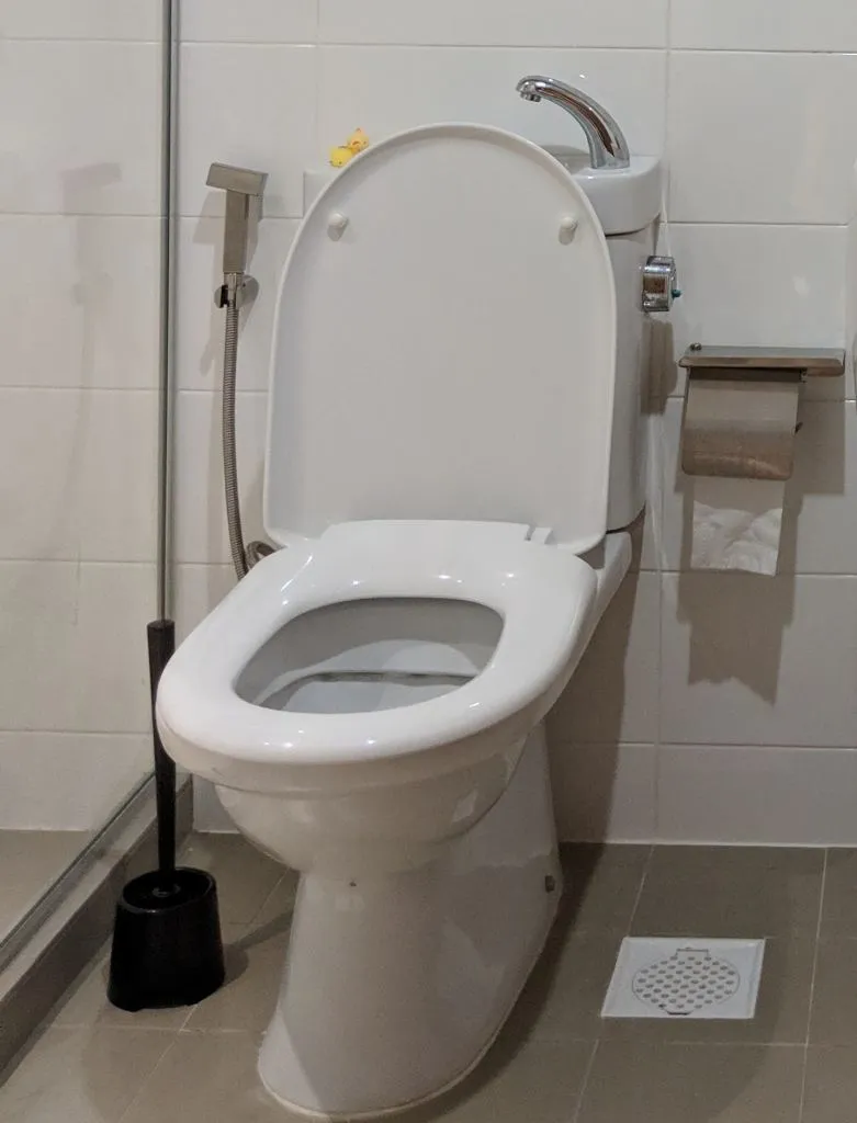 The common toilet tap is longer than normal taps. This makes it a little harder to wash our faces. But we just had to get used to it.