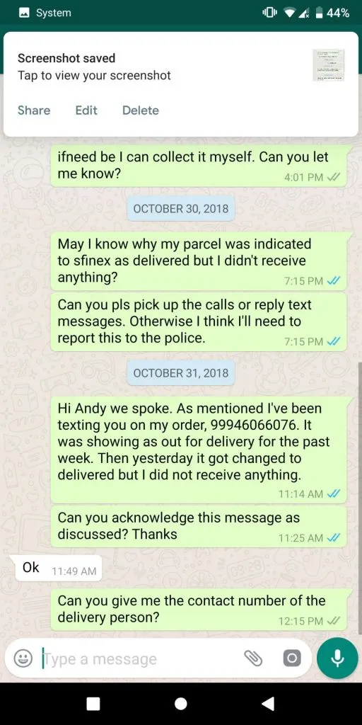 We sent the text he wanted, but he again didn’t acknowledge it. We had to call a few times and asked Last Mile Delivery Pte Ltd to tell him to acknowledge it.